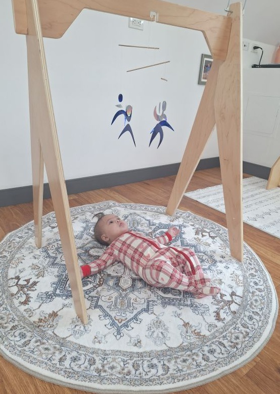 Montessori Mobiles — like the Dancers Mobile pictured here — are designed to engage the baby without being visually or auditorily overstimulating. Undisturbed time to watch the mobile provides the infant time to strengthen their visual and cognitive development. The baby naturally lets their caregiver know when they are finished with the mobile by looking away.