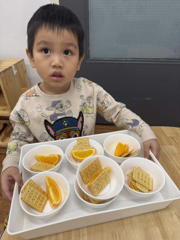 The pride a child feels when he prepares morning snacks for his peers! This took place during one of our school tours, and made a big impression on the visiting parents.